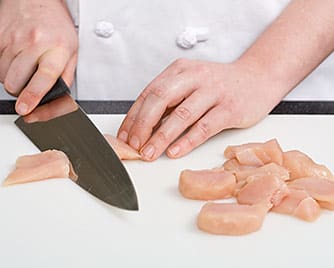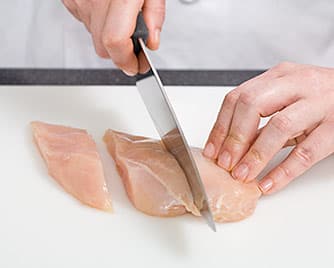 1. Using a chef's knife, cut each chicken breast on the bias into thirds.