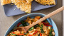 1. CUT AND BRINE Following photos, cut each chicken breast diagonally into thirds, then cut each third diagonally into ½-inch-thick pieces. Whisk water, tablespoon salt, and Worcestershire in large bowl until salt dissolves. Add chicken pieces and refrigerate, covered, for 30 minutes.